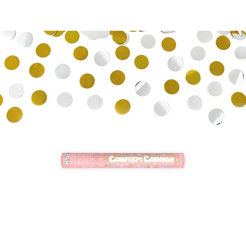 Konfetové delo fungujúce na systém stlačeného vzduchu. Po otočení valca v smere šípky vystrelí zlaté a strieborné konfety.