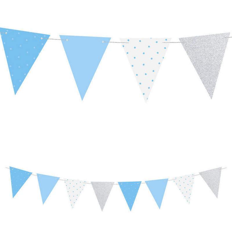 Girlanda obsahuje vlajky v nasledovných farbách : 2 ks trblietavé strieborná, 2 ks bledomodré, 2 ks biele s modrými hviezdami a 2 ks modré s hviezdami.