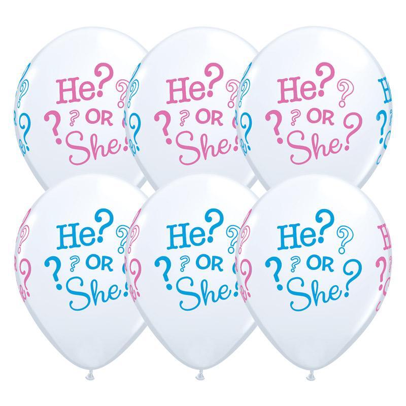 Balenie obsahuje 6ks balónov s potlačou HE or SHE a otázniky , biele balóny.