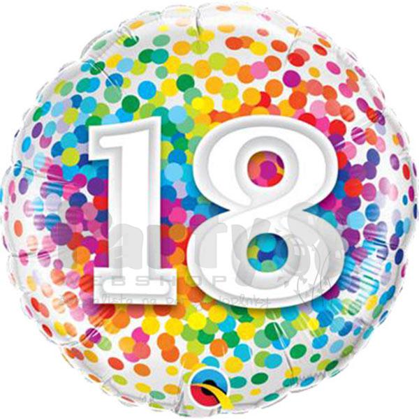 Farebný balón s veselým motívom s konfetami s číslom 18. Dokonalý darček k 18.-tym narodeninám.