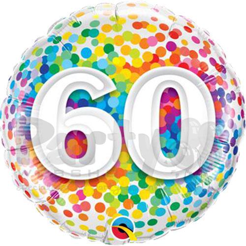 Farebný balón s veselým motívom s konfetami s číslom 60. Dokonalý darček k 60.-tym narodeninám.