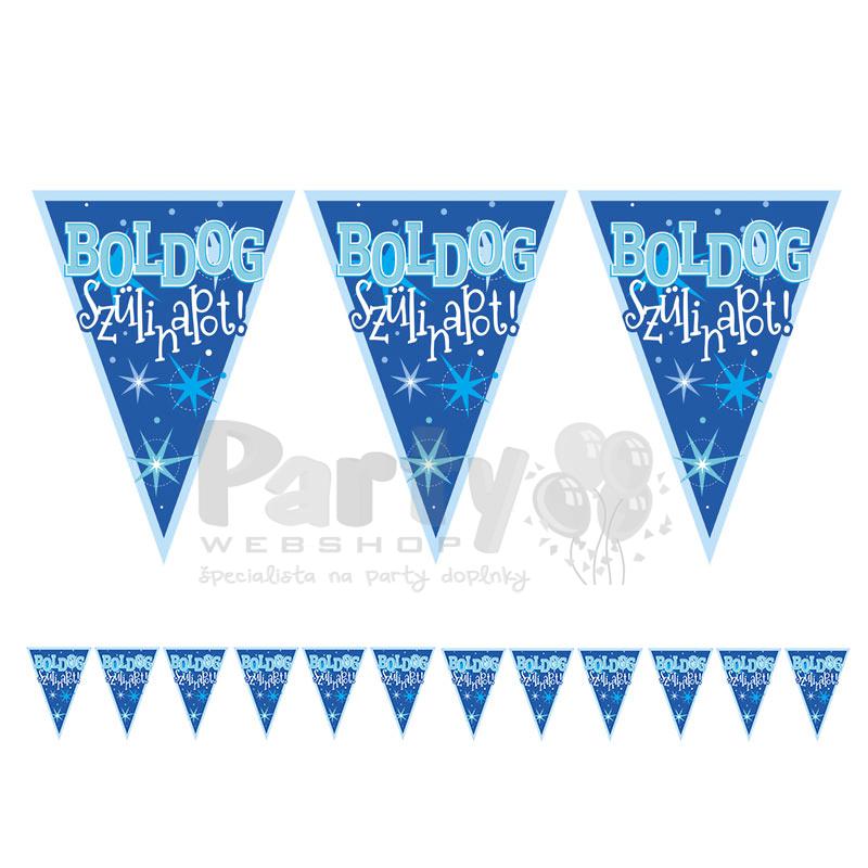 Modrá vlajková girlanda s maďarským nápisom Boldog szülinapot.