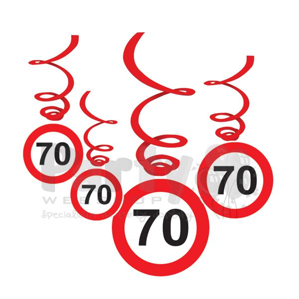 Visiaca špirálová narodeninová dekorácia s číslom 70 v tvare zákazovej dopravnej značky.