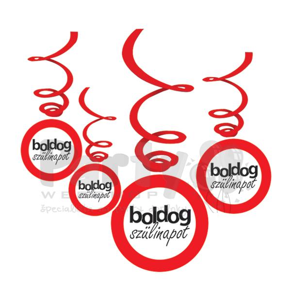 Visiaca špirálová narodeninová dekorácia s maďarským nápisom Boldog Szülinapot v tvare zákazovej dopravnej značky.