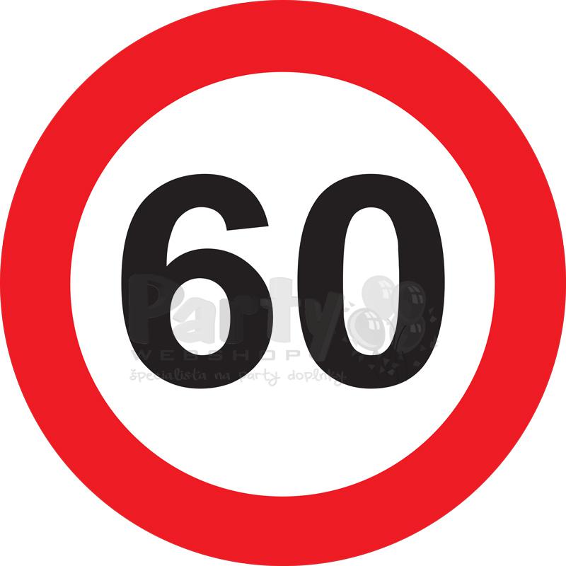 Tabuľa s číslom 60 v tvare zákazovej dopravnej značky. Touto tabuľkou viete oznámiť svetu, že vy už máte 60-ku.