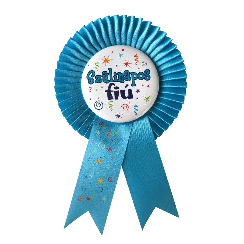 Szülinapos Fiú feliratú szalagos mintás kitűző, mely kitűnő kiegészítő az ünnepeltnek.