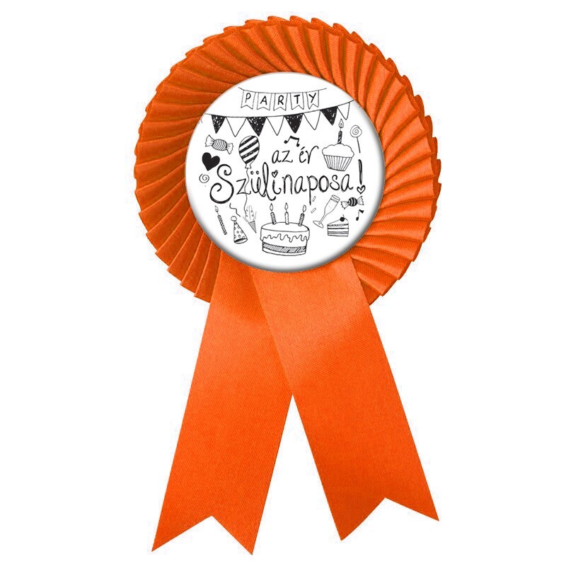 Az Év Szülinaposa! feliratú fehér szülinapi, narancssárga szalagos kitűző az ünnepeltnek.