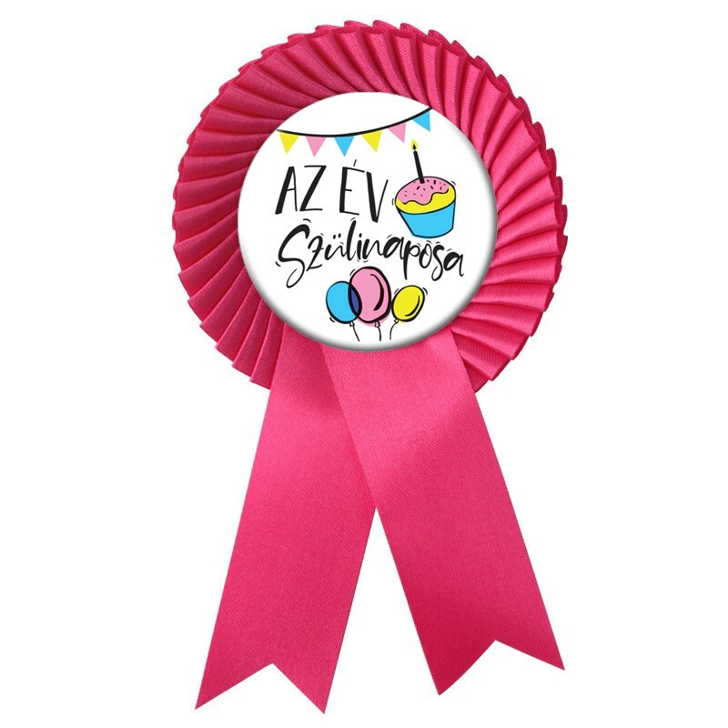 Az Év Szülinaposa! feliratú színes szülinapi, magenta rózsaszín szalagos kitűző az ünnepeltnek.
