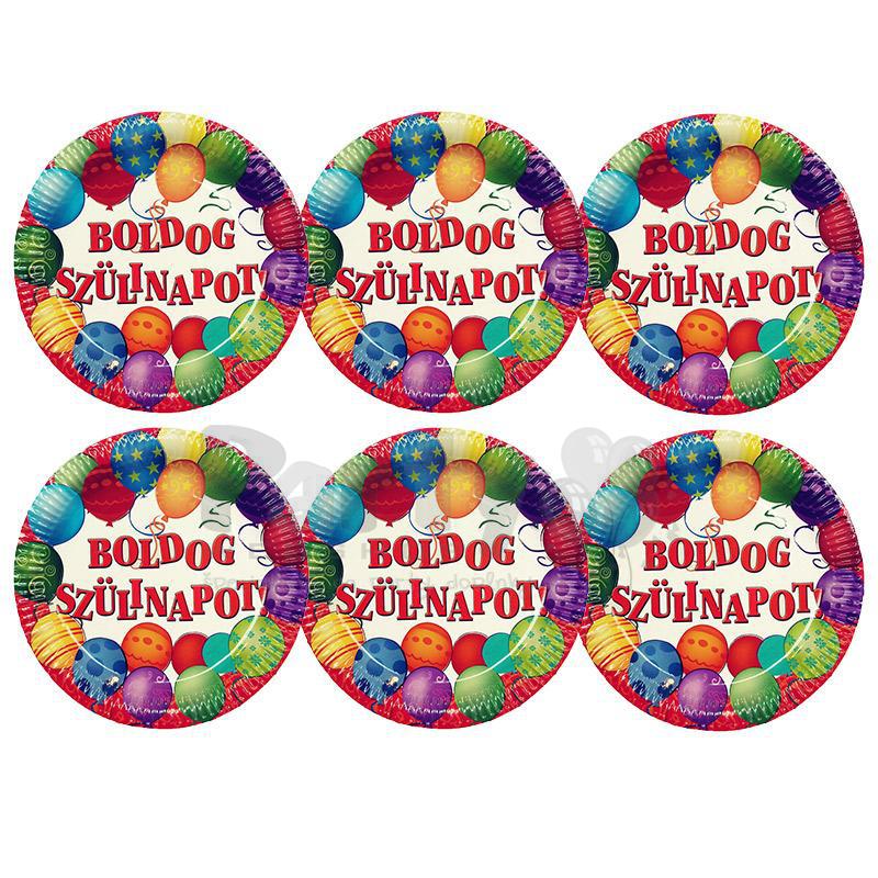Party taniere s motívom balónov a maďarským nápisom Boldog Szülinapot - 23 cm, 6 ks