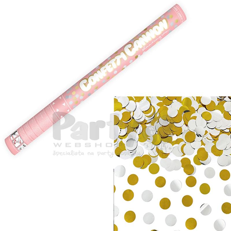 Konfetové delo fungujúce na systém stlačeného vzduchu. Po otočení valca v smere šípky vystrelí zlaté a strieborné konfety.