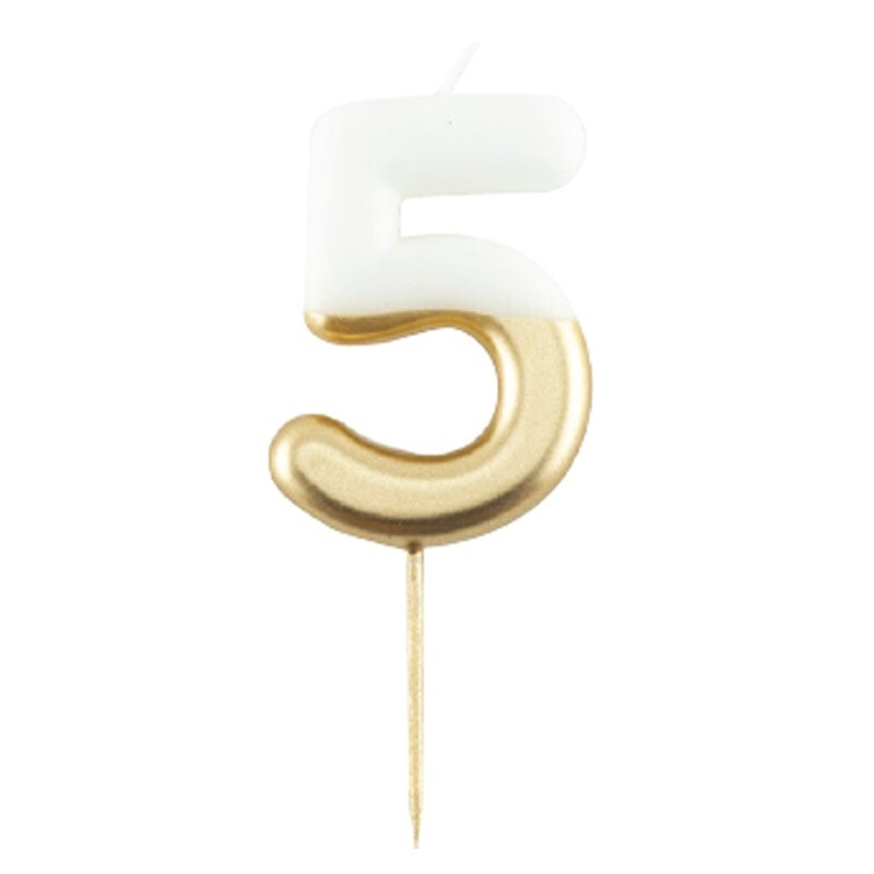 Zlatá lesklá narodeninová sviečka na stojančeku číslo 5