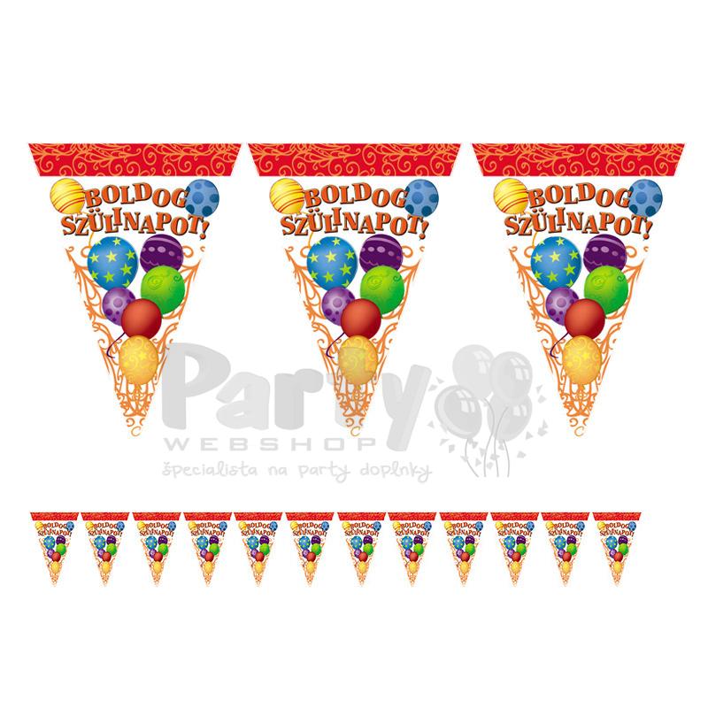Farebná vlajková girlanda s balónovou grafikou a s maďarským nápisom Boldog Szülinapot!