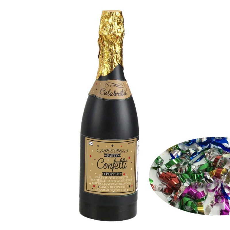 Konfetové delo na princípe stlačeného vzduchu v tvare šampanského vystreľujúce farebné lesklé konfetty