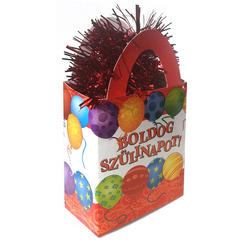 Színes születésnapi léggömbnehezék Boldog Szülinapot felirattal.